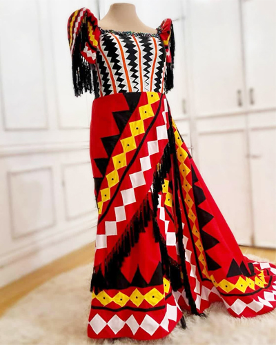 "This neo-ethnic collection, which features the tnalak, inaul, and other indigenous materials and styles, signifies a woman who always believes in herself, is determined to achieve her dreams in life, and can show to the world that she is versatile," says Ador.